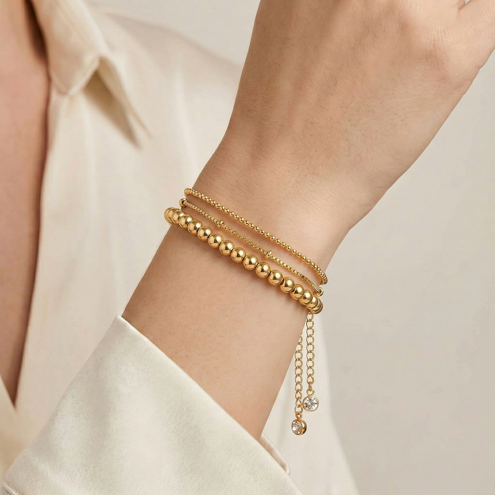 Brățară elegantă placată cu aur, cu un design în straturi format din lanțuri fine și biluțe decorative care oferă un aspect modern și rafinat. Modelul delicat creează un efect sofisticat pe încheietură, fiind perfect atât pentru ținutele de zi, cât și pentru cele elegante. Un accesoriu feminin și versatil care adaugă stil și strălucire oricărei apariții.