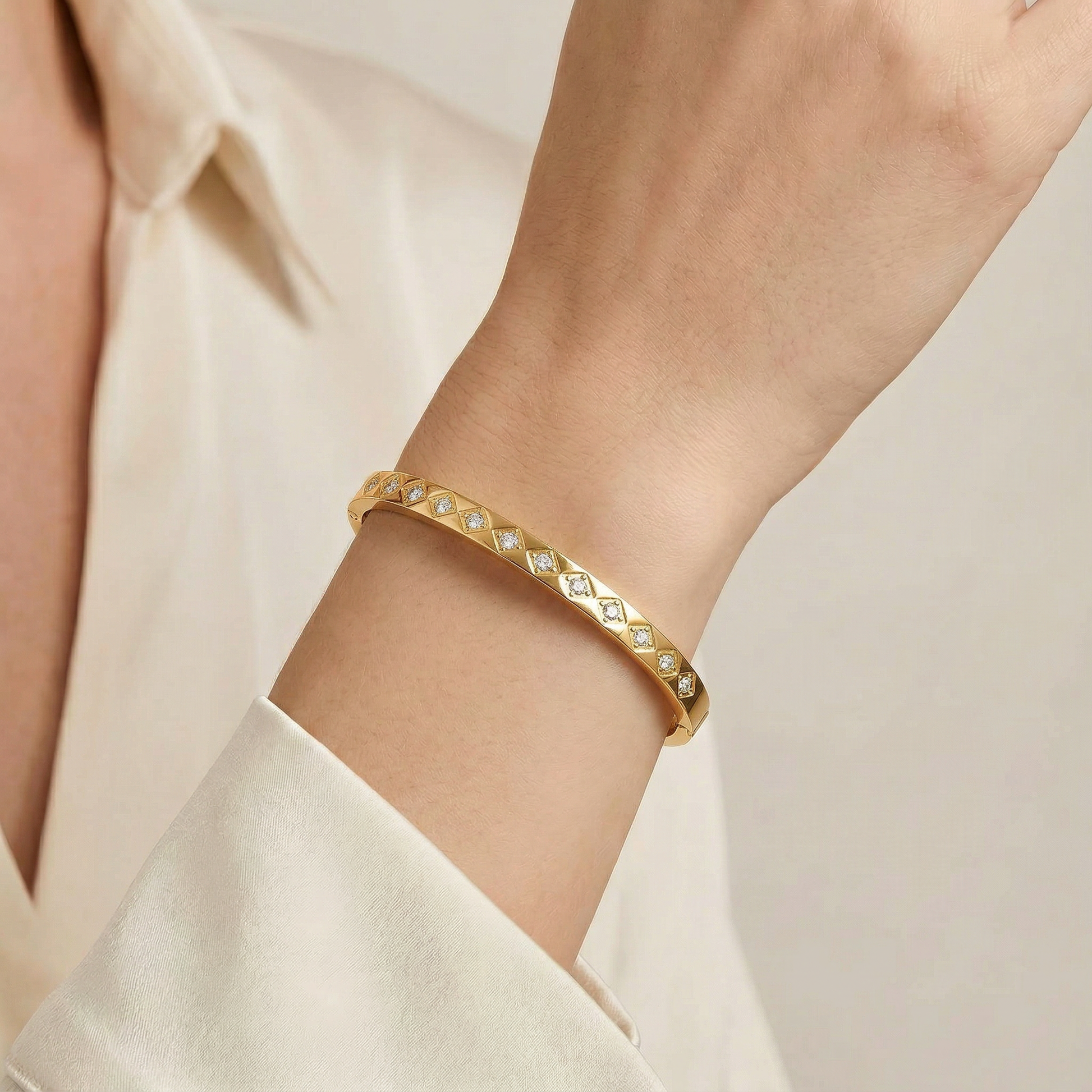 Brățară elegantă placată cu aur, decorată cu mici cristale strălucitoare care adaugă un plus de rafinament și lumină. Designul subțire și delicat o face perfectă pentru purtare zilnică sau pentru a completa ținutele elegante. Un accesoriu feminin și versatil, ideal pentru un look sofisticat și modern.