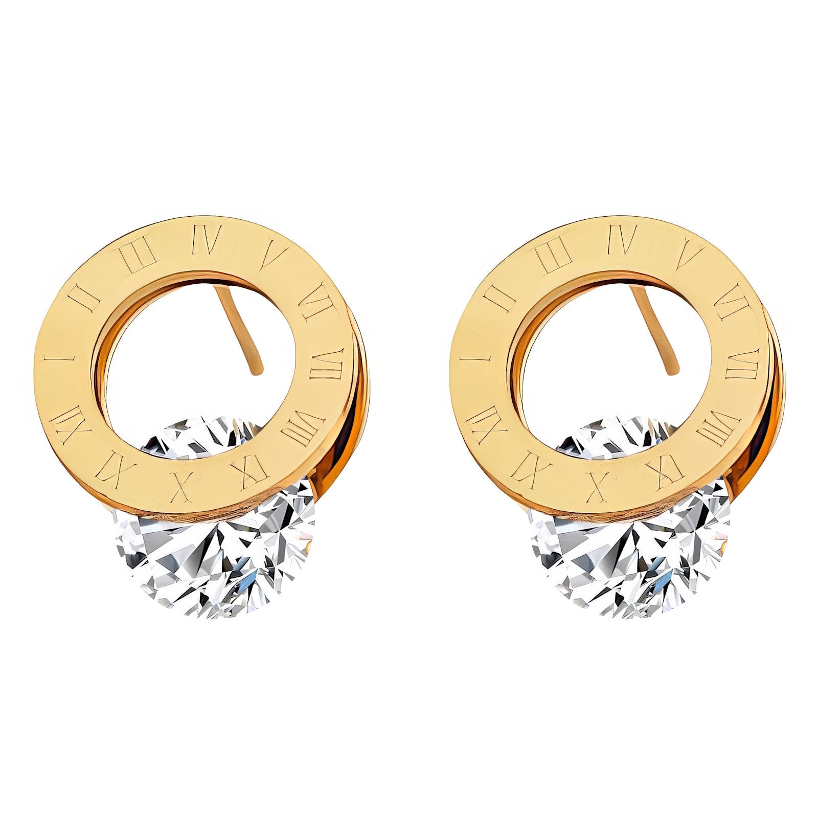 Cercei eleganți placați cu aur, decorați cu un cristal strălucitor care reflectă lumina și adaugă un plus de rafinament oricărei ținute. Designul modern, completat de detaliile fine inspirate de cifrele romane, oferă un aspect sofisticat și feminin. Perfecți pentru purtare zilnică sau pentru ocazii speciale, acești cercei sunt accesoriul ideal pentru un look elegant și stilat.