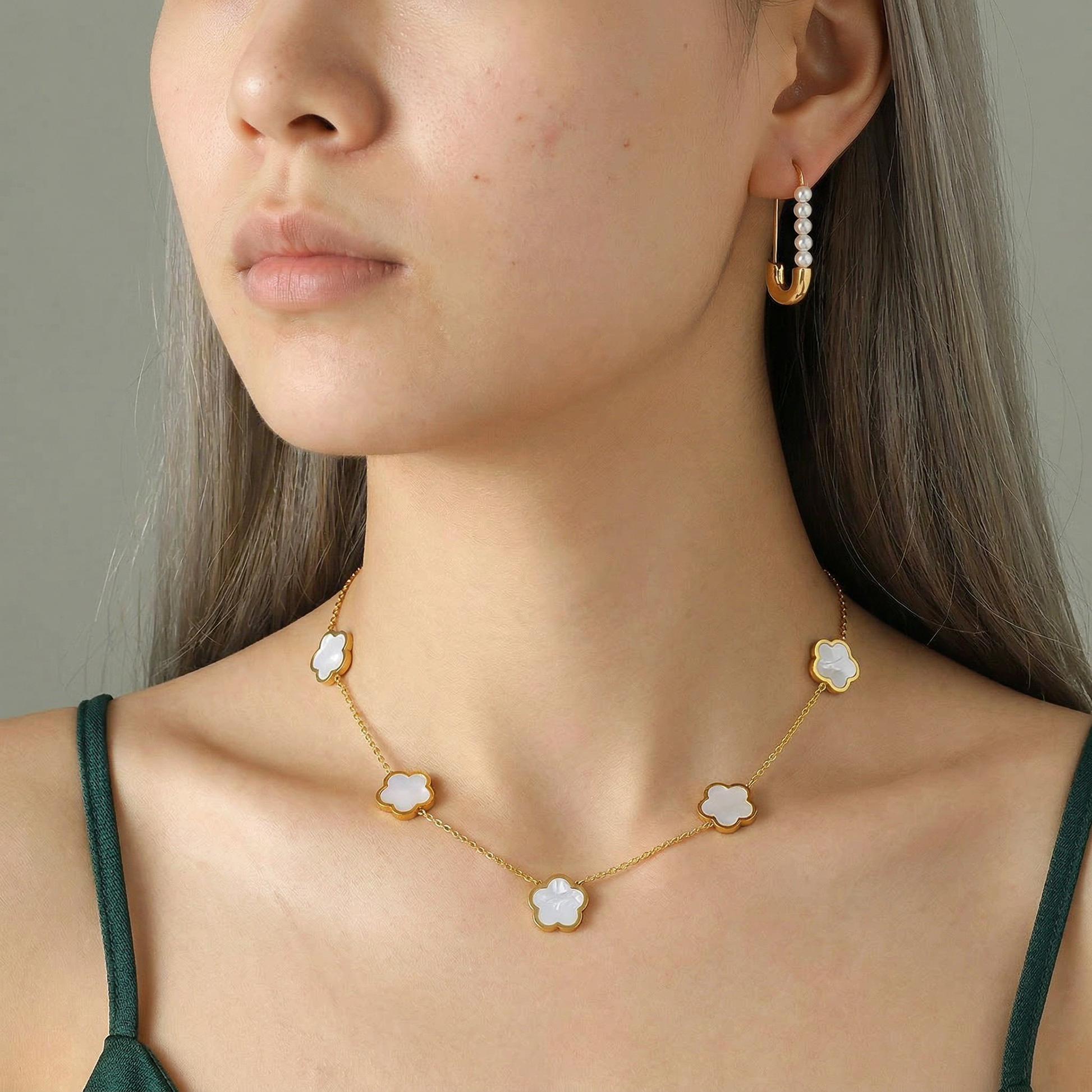 Colier elegant placat cu aur, decorat cu delicate simboluri în formă de trifoi alb dispuse armonios de-a lungul lanțului. Designul fin și luminos oferă un aspect feminin și rafinat, potrivit atât pentru ținutele de zi, cât și pentru cele elegante. Un accesoriu versatil care adaugă stil și eleganță oricărei apariții.