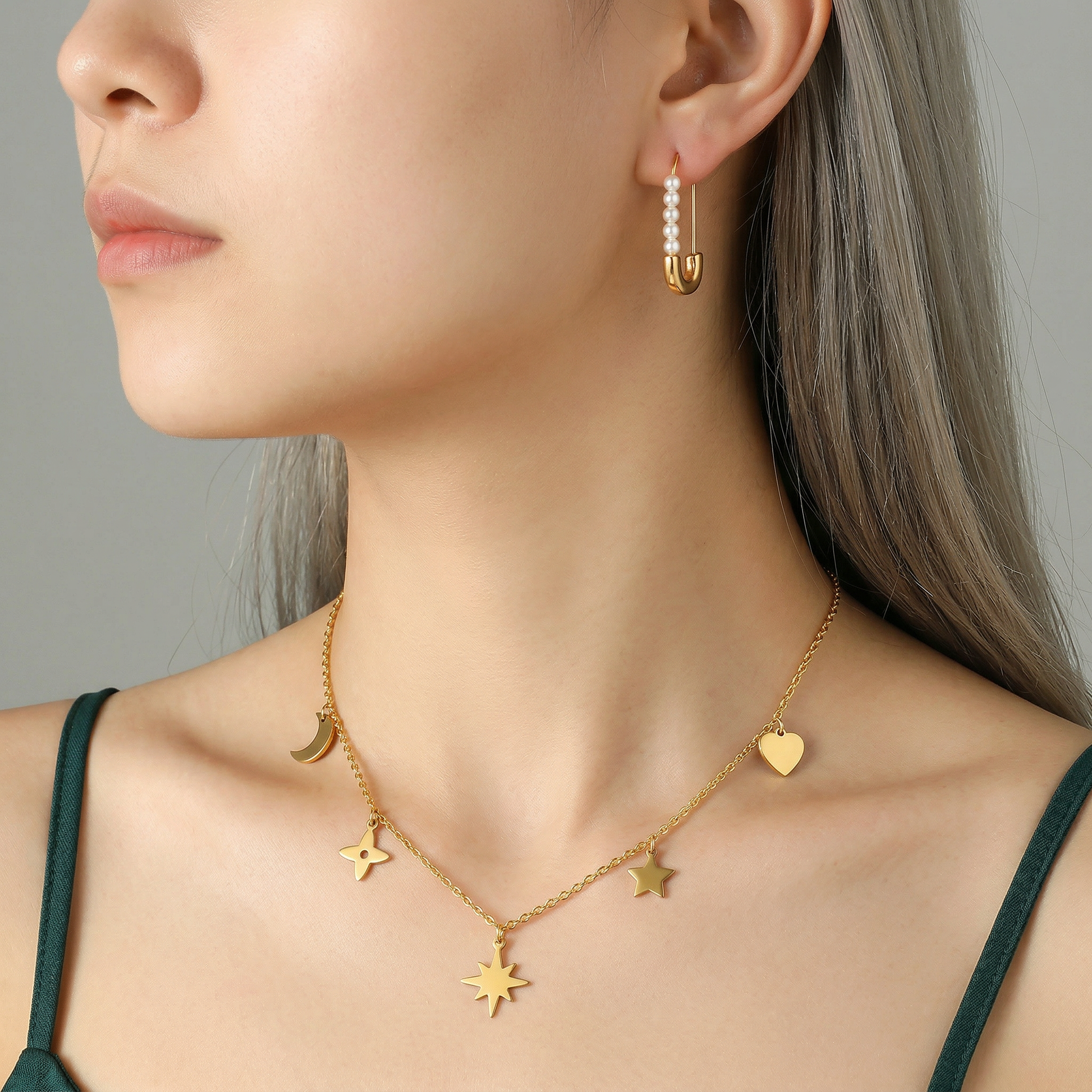 Un colier elegant placat cu aur, cu un design delicat și modern, decorat cu pandantive simbolice, stea, lună și inimă. Lanțul fin susține un pandantiv central în formă de stea radiantă, completat de mici detalii laterale care adaugă un aer romantic și rafinat. Perfect pentru a oferi un plus de strălucire oricărei ținute, fie de zi, fie de seară.